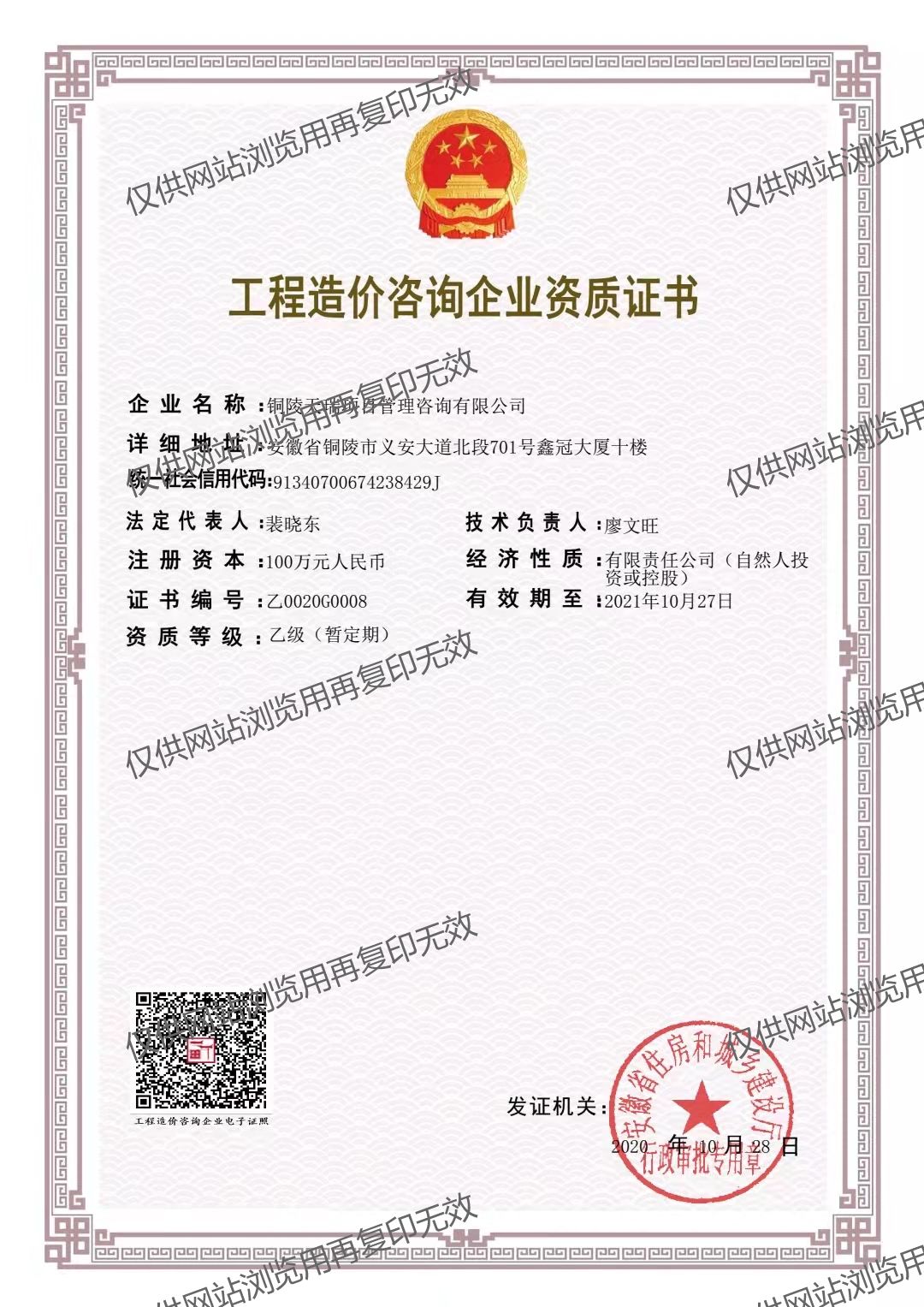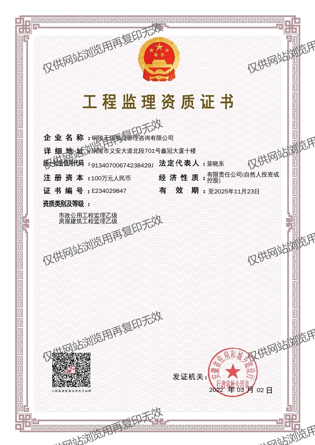 銅陵天瑞項目管理公司具有:工程監(jiān)理乙級資質(zhì)、工程造價乙級資質(zhì)、招標代理及政府采購資質(zhì)(備案)、工程咨詢資質(zhì)(備案)等資質(zhì)。